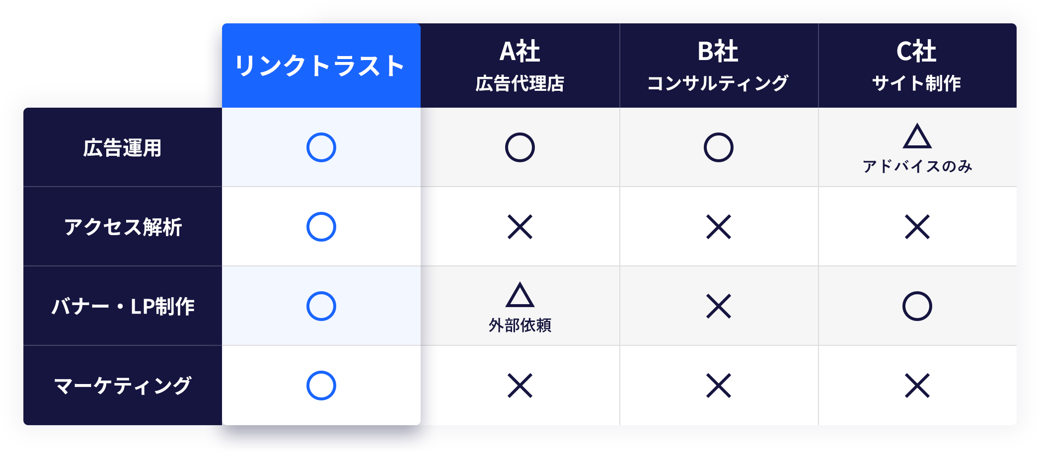 広告運用はA社、解析はB社、制作はC社と、プロセスが分断されていると、各プロセスを連動させることができず、効果が充分に発揮されません。領域ごとに会社が分かれているので情報交換が煩雑になり、コミュニケーションコストも上がってしまいます。また、リスティング広告の代理店や制作会社ごとに個別のサービスしか提供してもらえないケースでは、お客様が投資したコストを最大限活用できません。