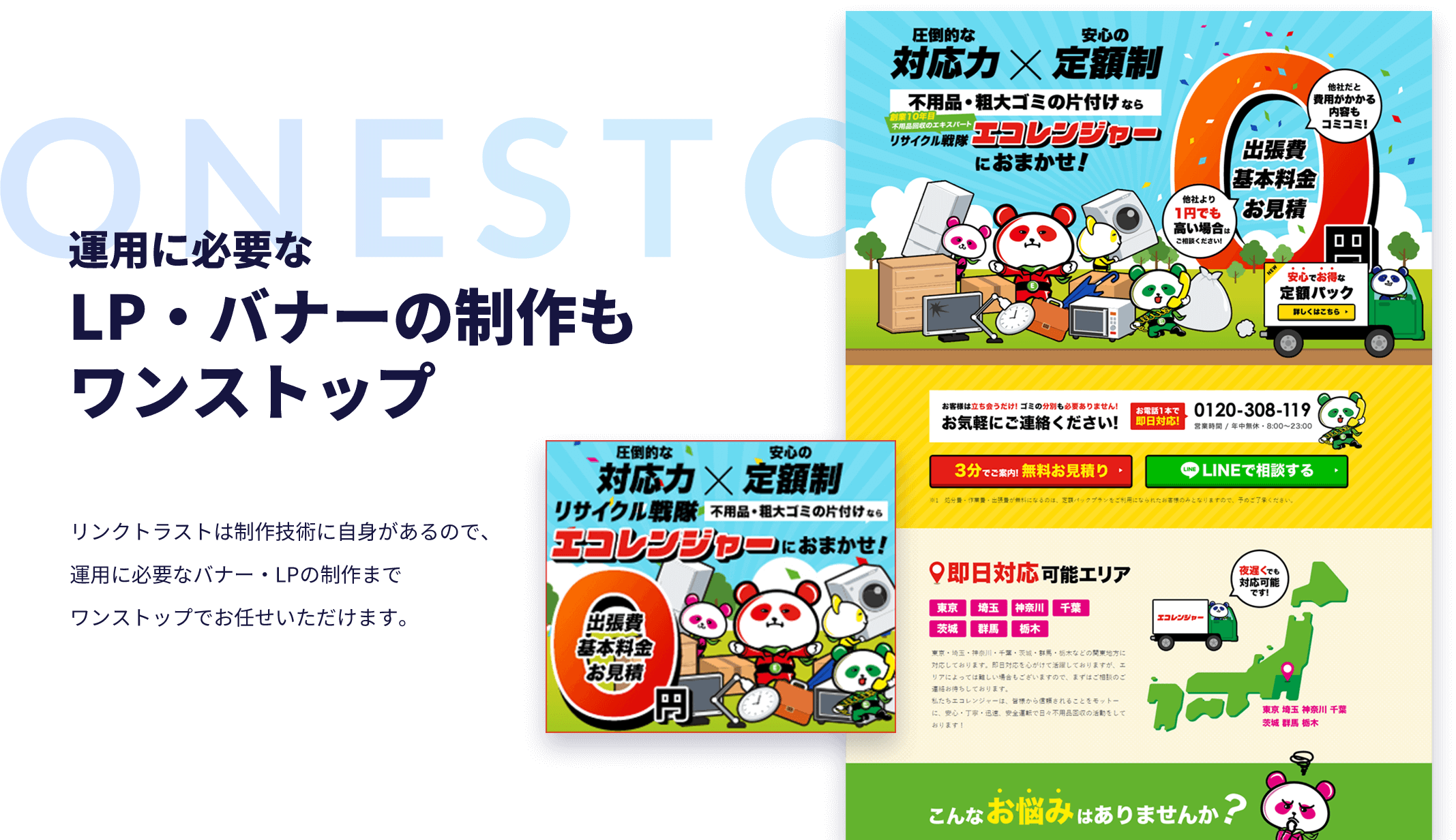 リスティング広告に、より効果を持たせたい方は、リスティングの前の、制作からお任せください。Link-Aは元々、マーケティングやWeb制作も行っておりますので、より多いコンバージョンに向けて、トータルでお任せいただけます。
