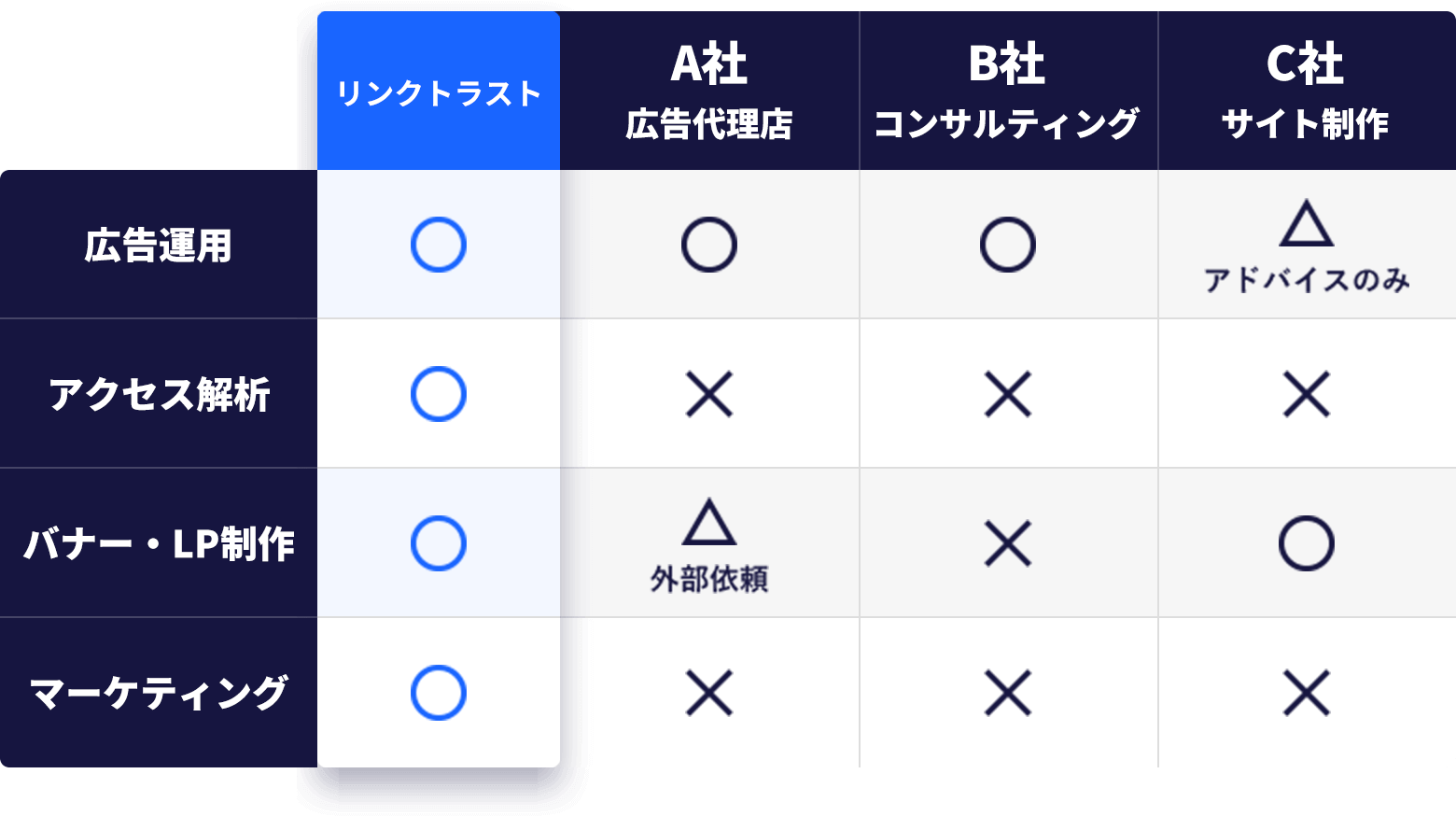 広告運用はA社、解析はB社、制作はC社と、プロセスが分断されていると、各プロセスを連動させることができず、効果が充分に発揮されません。領域ごとに会社が分かれているので情報交換が煩雑になり、コミュニケーションコストも上がってしまいます。また、リスティング広告の代理店や制作会社ごとに個別のサービスしか提供してもらえないケースでは、お客様が投資したコストを最大限活用できません。